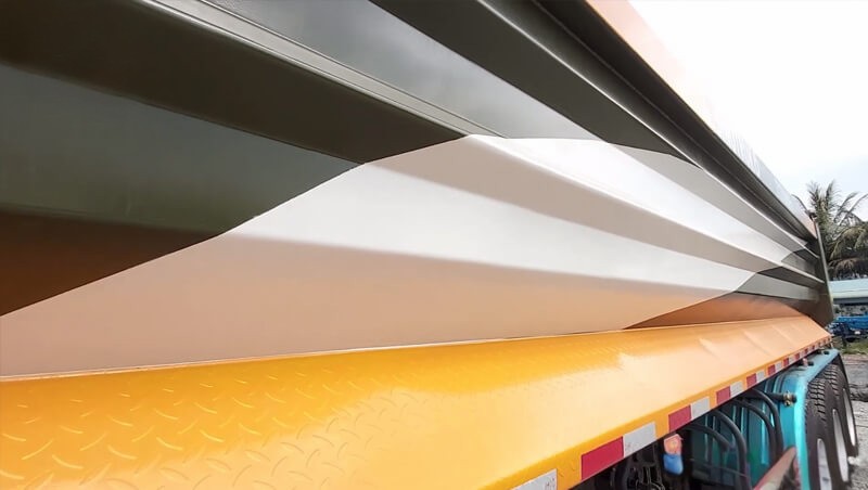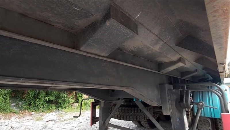 Đáy thùng bằng thép dày 6 ly thùng được vát 2 bên giúp vật liệu đổ xuống dễ dàn khi nâng hạ thùng ben. Hai bên thành thùng làm bằng thép dày 4 ly được dập 2 gân sóng lớn xuyên suốt tăng cứng